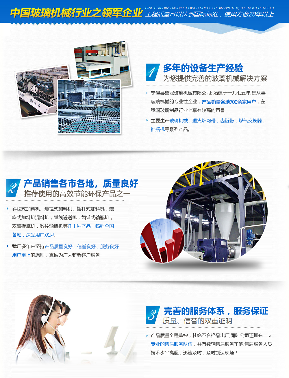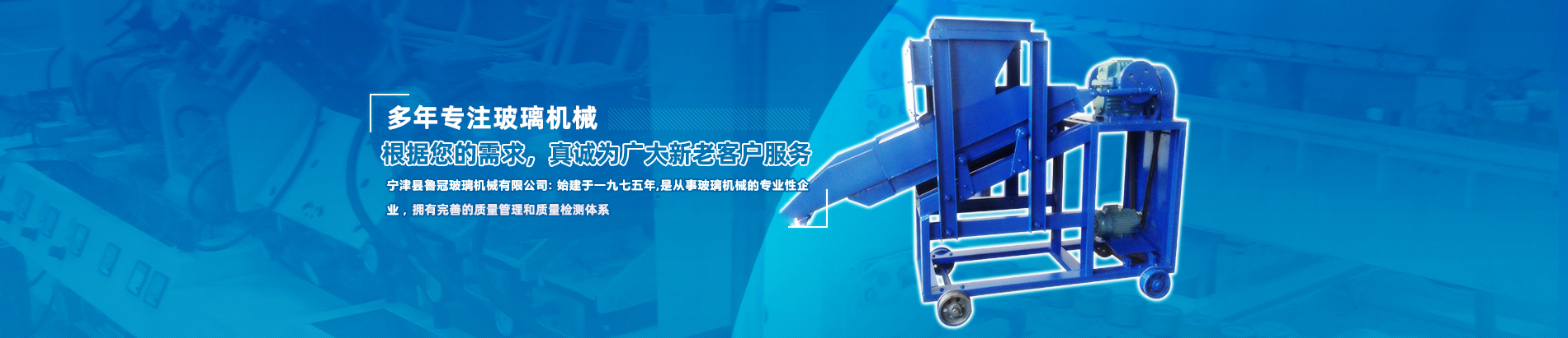 山東魯冠玻璃機(jī)械有限公司,是從事玻璃機(jī)械的專注性企業(yè),產(chǎn)品行銷各地700余家用戶,在我國玻璃制品行業(yè)上享有較高的聲譽(yù)。目前主要生產(chǎn)玻璃加料機(jī),玻璃混料機(jī),煤氣交換器,玻璃原料自動配料等玻璃機(jī)械設(shè)備。此外,我公司具備良好的整體素質(zhì)和渾厚的技術(shù)力量,制造工藝完善,設(shè)備完善,具備完善的質(zhì)量管理和質(zhì)量檢測體系。企業(yè)堅持“科學(xué)技術(shù)是主要生產(chǎn)力”的主導(dǎo)思想,不斷加強(qiáng)新產(chǎn)品研發(fā)力度,玻璃機(jī)械產(chǎn)品的開發(fā)生產(chǎn),為適應(yīng)玻璃制品行業(yè)發(fā)展需要,相繼先后研制出:斜毯式加料機(jī)、懸掛式加料機(jī)、強(qiáng)制式混合機(jī)等幾十種產(chǎn)品,銷售各地,深受用戶歡迎。 我公司產(chǎn)品已實現(xiàn):網(wǎng)帶鏈條、玻璃機(jī)械、輸送機(jī)械、玻璃原料自動混配、食品機(jī)械五大系列。我公司多年來堅持“用戶至上”的原則,真誠為廣大新老客戶服務(wù),竭誠歡迎廣大新老客戶光臨惠顧!